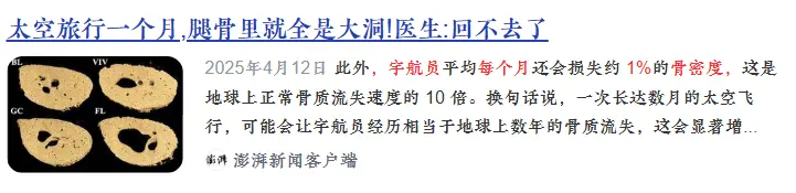 公开数据显示,长期驻留航天员每月骨密度可能下降1%至2%,半年时间,累计流失可达约10%左右,相当于地面老年人多年自然流失水平。